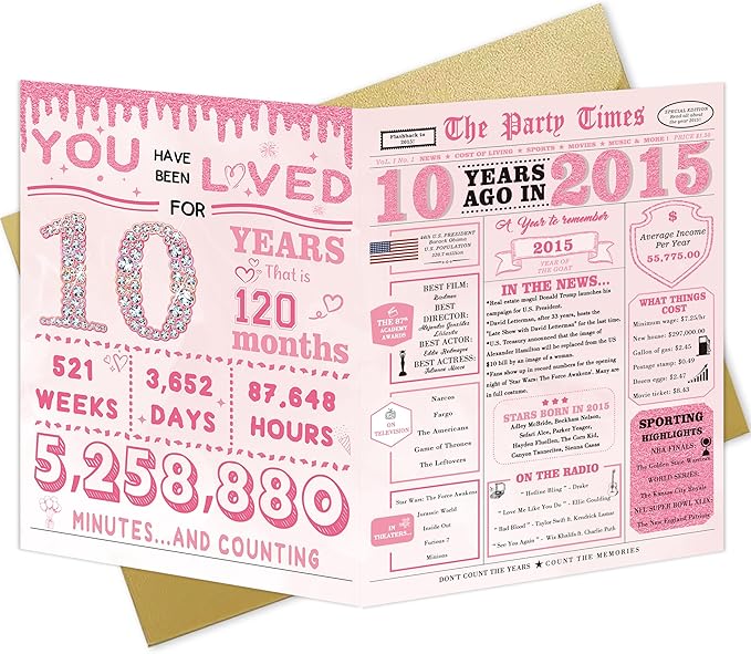 - Best 10th Birthday Card: Celebrate your girl's journey of 120 magical months with this cute newspaper-style card that captures her birth year 2015,Turns 10th birthday into a "Born in 2015" time-travel experience,it's more than a card,it's a love letter to the 3,652 days you've watched her grow into this radiant 10-year-old star. This beautifully designed card is perfect for celebrating a special girl's 10th birthday.