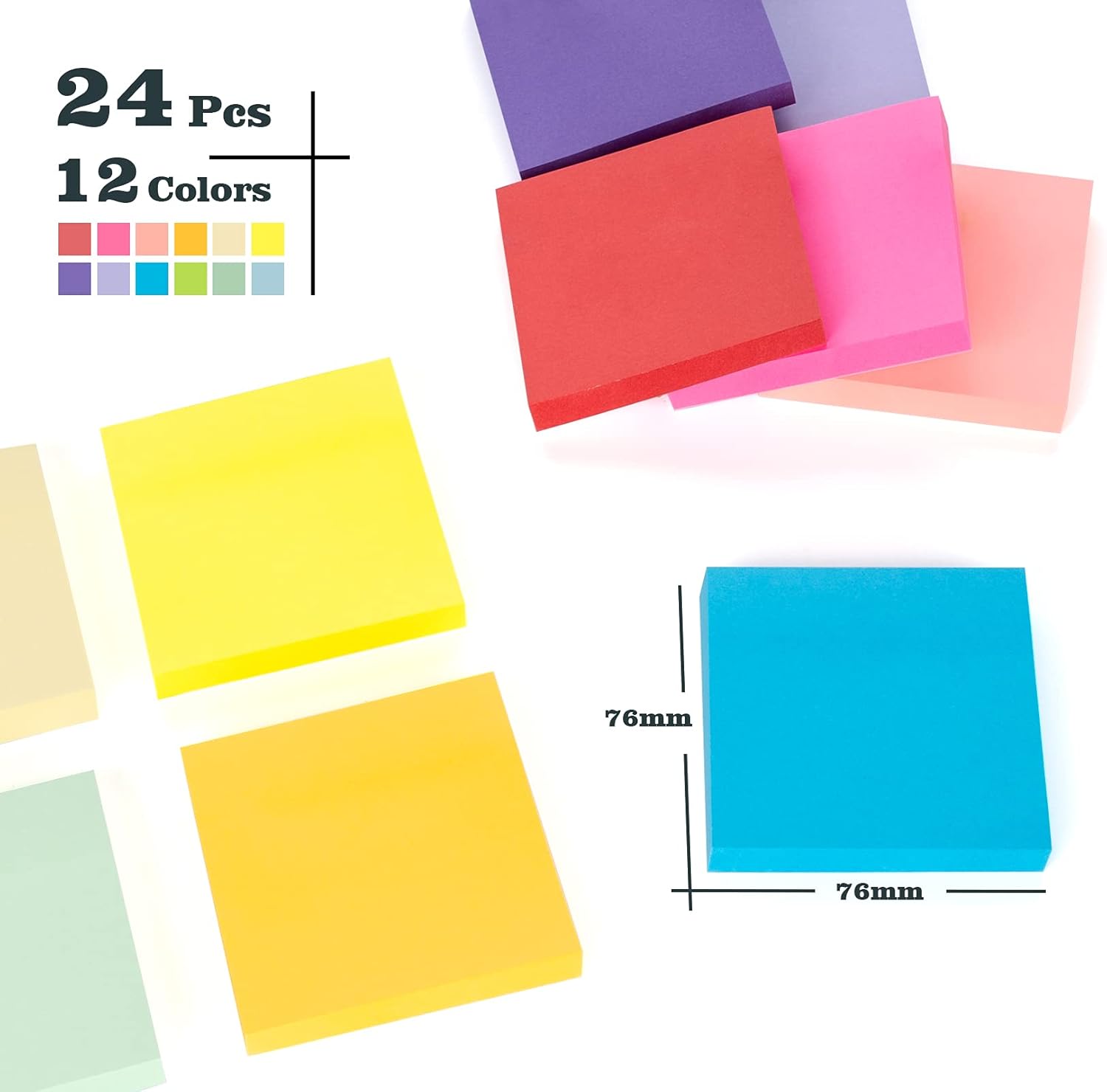 - Portable Size: Each pack contains 24 Pad/Pack 3x3 in(76mm x 76 mm),100 sheets/Pad, Total 2400 sheets.Large reminder notes and sufficient quantity are ideal for keeping track of to-do and grocery lists, sports schedules, daily chores and due dates.