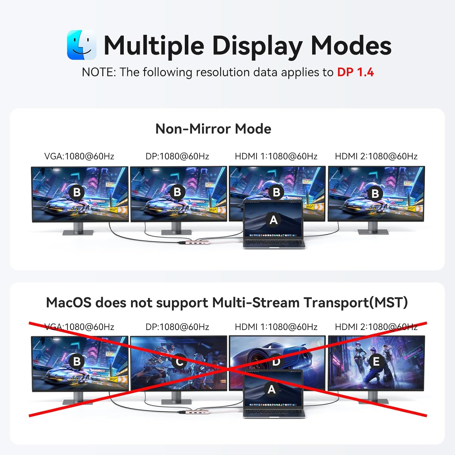 - Laptop Docking Station 4K Display Adapter: The USB C Docking Station Dual HDMI Splitter with 4 video output ports: 2 HDMI+DP+VGA. For single display, HDMI can reach 8K@30HZ or 4K@144HZ; For dual display and triple display, Can output up to 4K Dual/Triple Display videos(For laptop with DP 1.4 DSC); For quadruple display, Dual HDMI, DP, and VGA all are 1080@60Hz. Please make sure your laptop specification support DP1.4 signal output. If the VGA port is connected, it will affect the resolution of all displays up to 1080P only