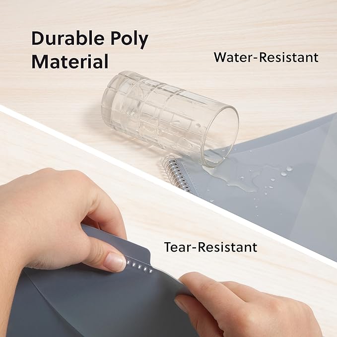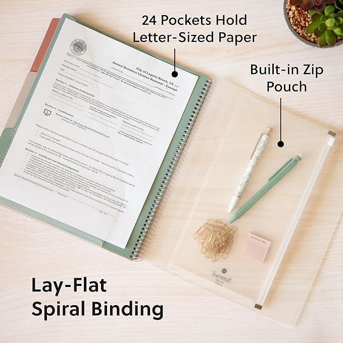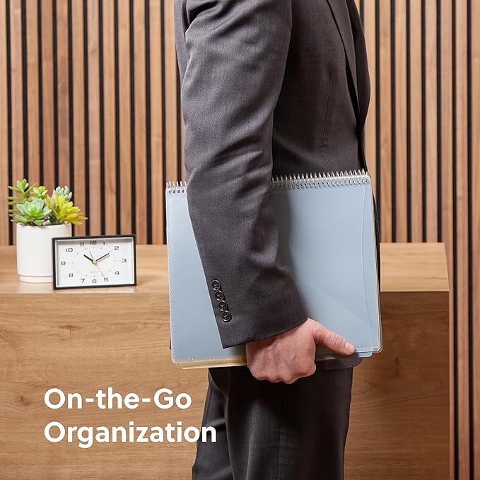 - PRACTICAL DESIGN: The slash pockets can hold up to 25 sheets each; the spiral-bound design allows the office supply organizer to lay flat for convenience and rotate 360° for easy viewing; tear-resistant and water-resistant poly cover material ensures long-lasting durability
