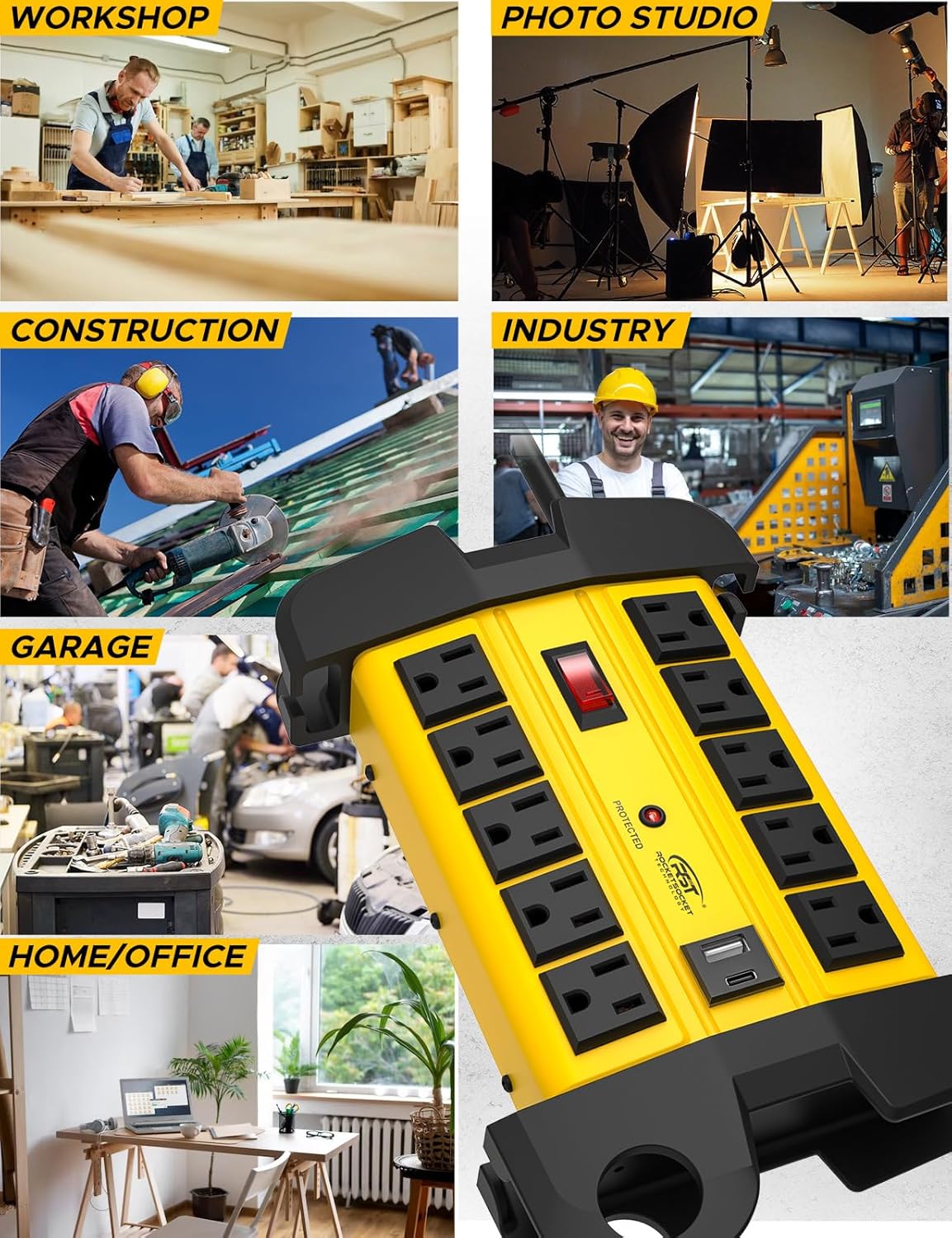 - [6Ft Cord & Metal Housing] Crafted with a 14 AWG ETL Certified cord, this power strip offers both durability and extended reach. This metal heavy duty power strip ensures enhanced safety and longevity, making it ideal for garages, workshops, and more.