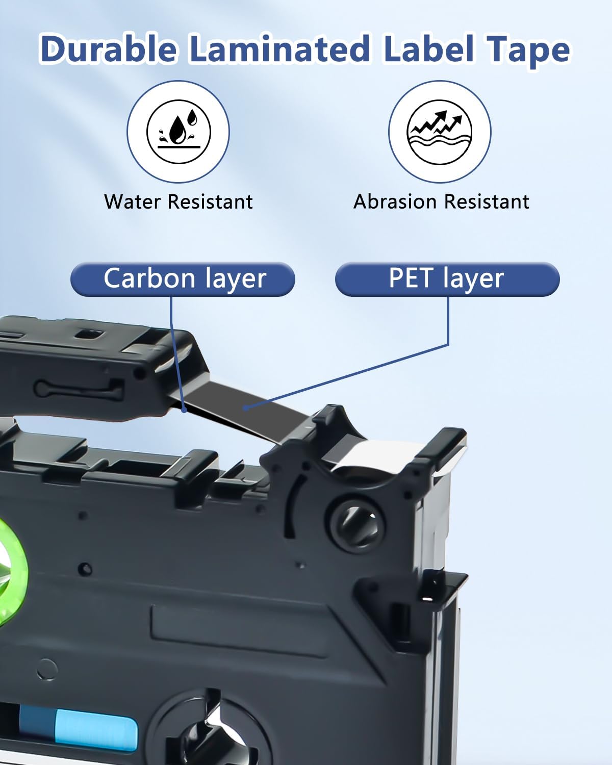 - Size & Color & Features: Width of Tape: 18mm 0.7 inch (3/4 inch); Length of Tape: 8m (26.2 feet); Color of Tape: Black Text Print on White Tape. Feature of Tape: Laminated, Strong Adhensive, Chemical and Water Resistant, Abrasion Resistant, Temperature Resistant, Fade Resistant.