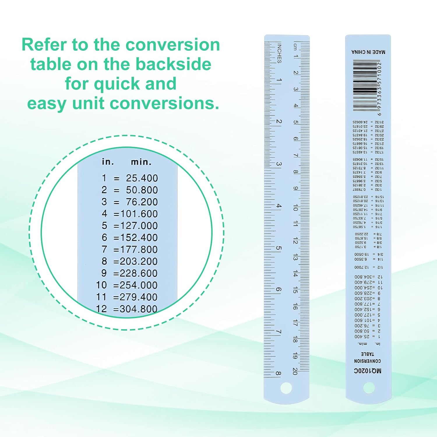 - Instruction: Use the ruler for precise measurements and calculations in both inches and centimeters. Refer to the conversion table on the backside for quick and easy unit conversion. Hang the ruler using the provided hole for convenient storage and accessibility.