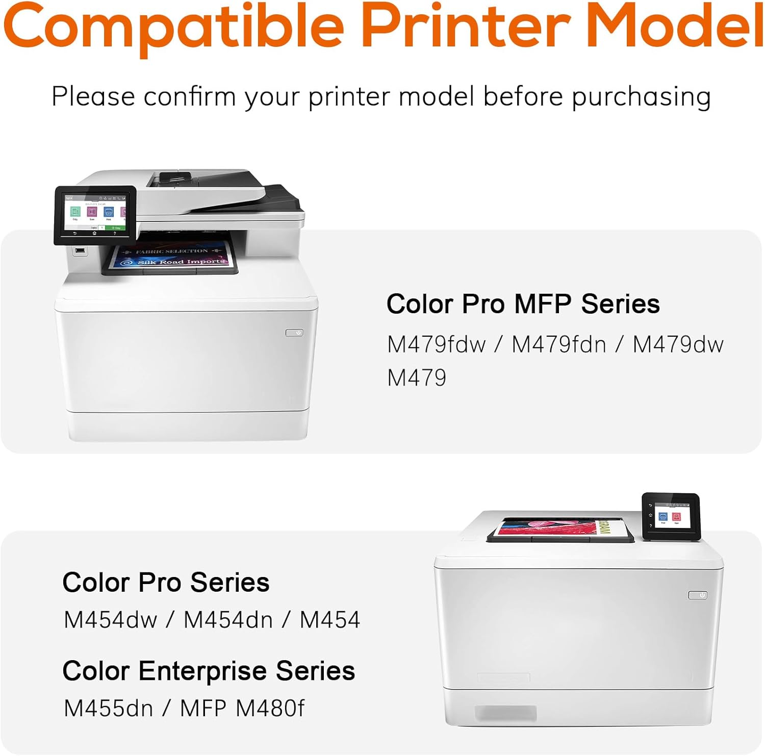 - Compatible Printers: The Jeostarky 414a toner cartridges are compatible with HP Color Laserjet Pro MFP m479fdw, M479fdn, M479dn, M479dw, M479 series; for HP Color Laserjet Pro M454dw M454dn M454 series; for HP Color Enterprise M455dn M480f series printer