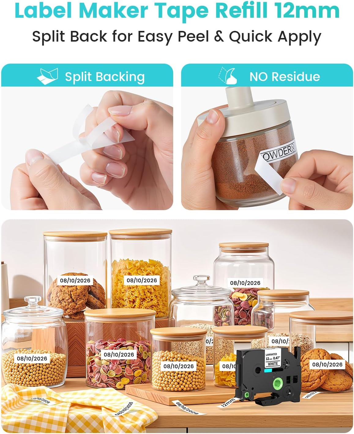 - 【Replacement for P Touch Label Tape Durable and Non-fading】Label maker tape refill 0.47 and Compatible with brother label maker tape 12mm 0.47 white won't fade even when exposed to sunlight, won't flake or curl over time. 1/2 white label tape strong adhesion, water withstand, wear withstand, corrosion withstand, high and low temperature withstand, grease withstand
