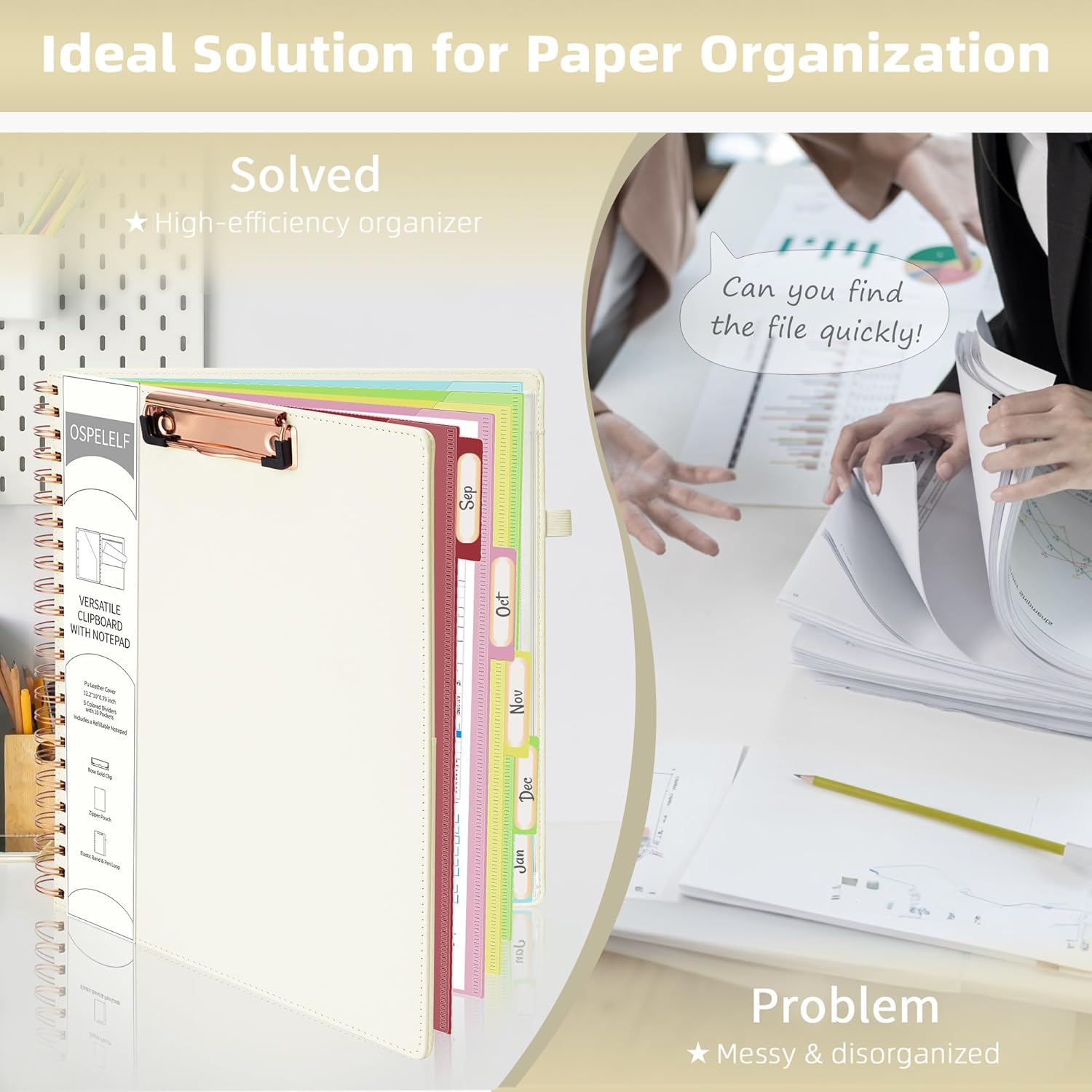 Ospelelf Leather Clipboard Folio with with Storage Zipper Pouch, Spiral Clipboard Folder with Notepad for Letter Size, 5 Folders with 10 Pockets, 39 Divider Label Stickers (Beige)