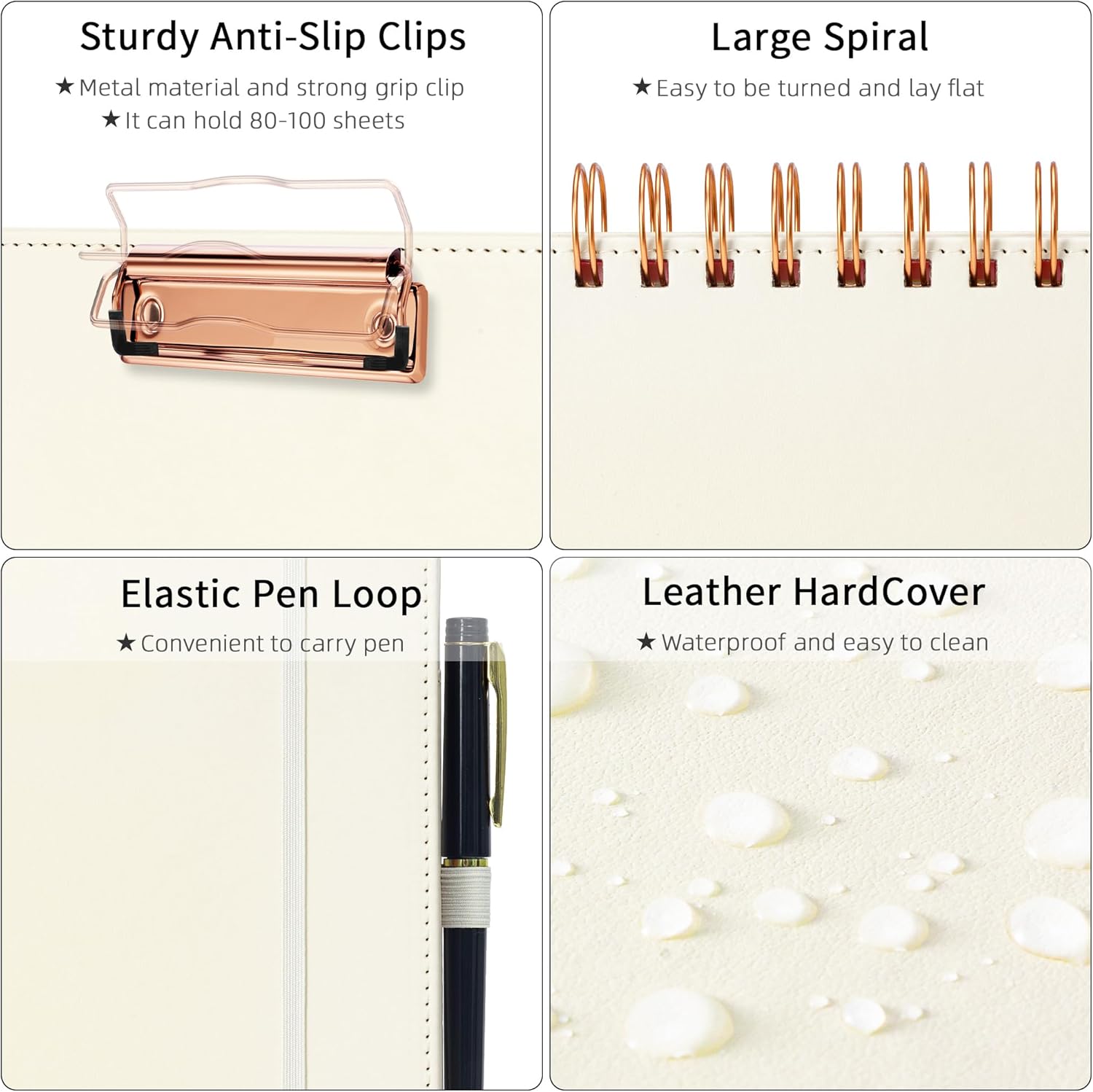 - 【powerful functions】Low-profile clip arc design make it easy gripping and extraction paper, holds up to 80-100 sheets paper. Clip board has a Hidden retractable hanging hole on the top, Easy to hang. Pen Loop for quick, easy storage. Double-loop Metal Spiral have the ability to flip the cover to the backside and use it like a clipboard, no creases and cracks to offer durability. Elastic closure, The elastic band keeps the portfolio closed and prevents contents from getting damaged.