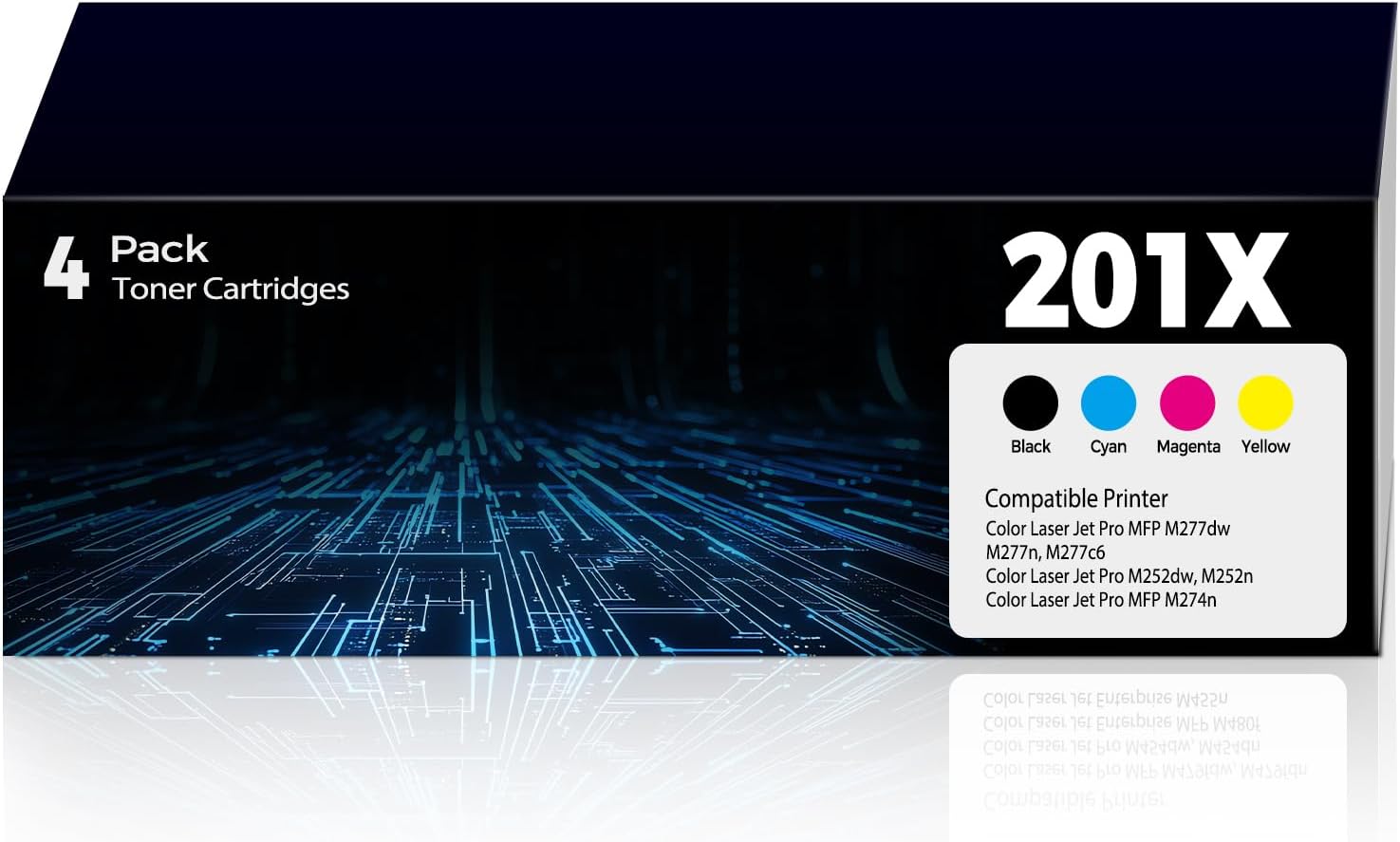 - Package Content: 4 Pack 201X toner including 1 x 201X black toner cartridge, 1 x 201X cyan toner cartridge, 1 x 201X magenta toner cartridge, 1 x 201X yellow cartridge.