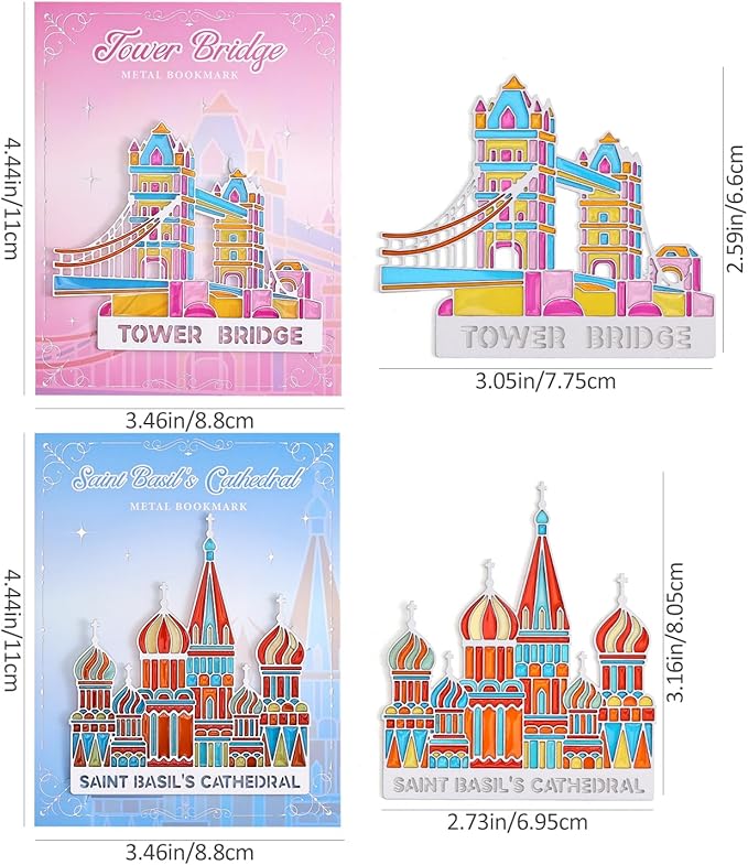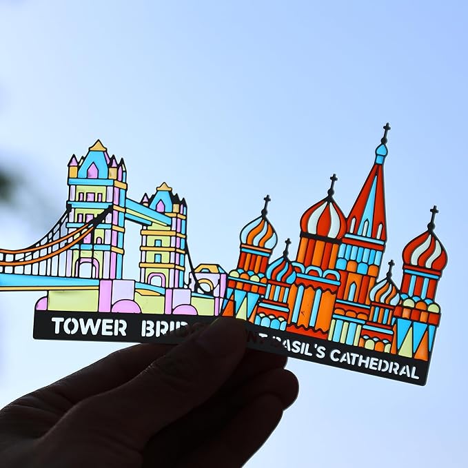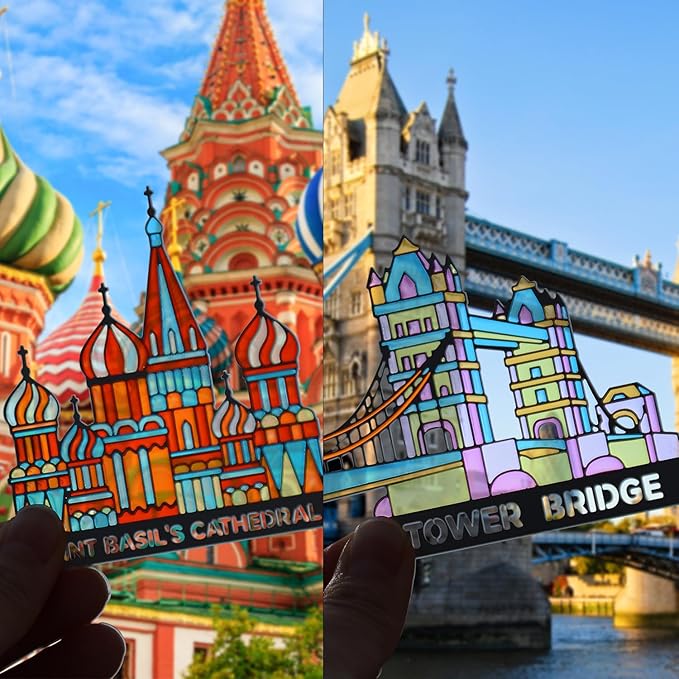 - Architectural Translucent Art: 1pcs Saint Basil's Cathedral design + 1pcs Tower Bridge design. Vibrant colors illuminate when light passes through, inspired by Gaudí’s masterpiece.