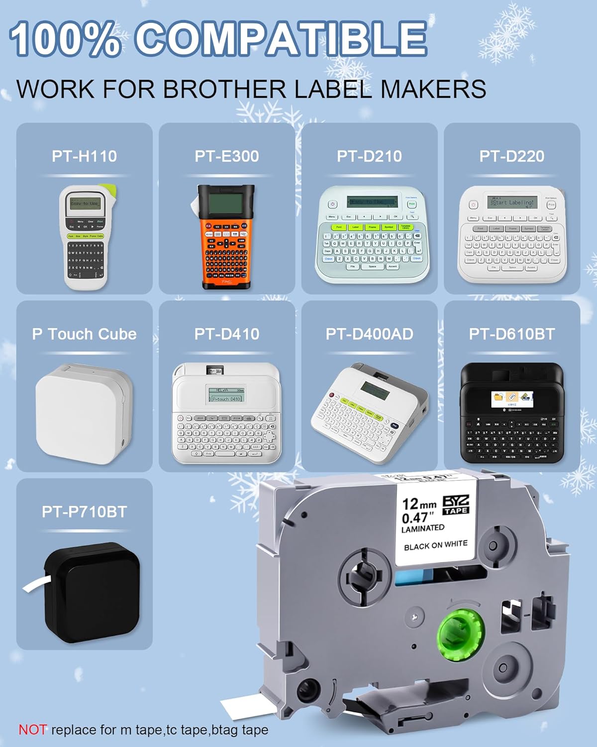 - Compatible with Brother P touch labeler ink tape such as : PT-D220,PT-E310BT,PT-D610BT,PT-H100,PT-H110,PT-H111,PT-E110,PT-D200,PT-D210,PT-E300,PT-P300BT(P Touch Cube)PT-D400,PT-D400AD,PT-D410,PT-D450,PT-D460BT,PT-D600,PT-P700,PT-P710BT,PT-P750W,PT-2730,PT-2730VP,PT-1000,PT-1000BM,PT-1010,PT-1010B,PT-1010NB,PT-1010RPT-1010RDT,PT-1010S, PT-1090,PT-1090BK,PT-1100,PT-1100QL,PT1100SB,PT-1100SBVP,PT-1100ST,PT-1120,PT-1130,PT-1160,PT-1170,PT-1170S,PT-1180,PT-1180SC,PT-1180SP,PT-1190,PT-11Q,PT-1200,PT-1230PC,PT-1280,PT-1280SR,PT-1290,PT-1880,PT-2030,PT-2030VP,PT-2430PC,GL-100,GL-H100,etc