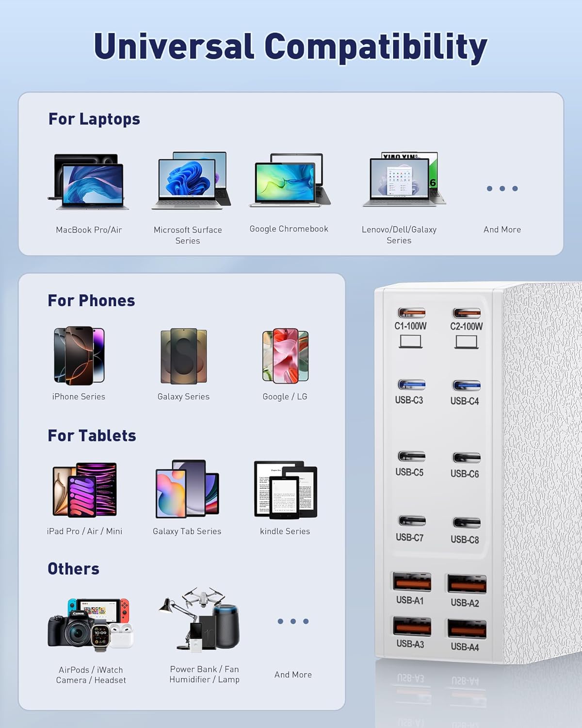 - 【Universal Compatibility】Our USB C charging station is equipped with 2*100W and 2*65W fast charging ports, which can charge 3 or more laptops at the same time. Compatible with smartphones, tablets and laptops, suitable for MacBook Pro/Air, Dell XPS, iPad Pro, iPhone 16/16 Pro Max, iPhone 15 Pro Max, iPhone 14/13 Pro/12 Pro Max, iWatch, AirPods, Surface Pro, Galaxy S24 Ultra, Switch, Steam Deck, Google Pixel and many other devices.