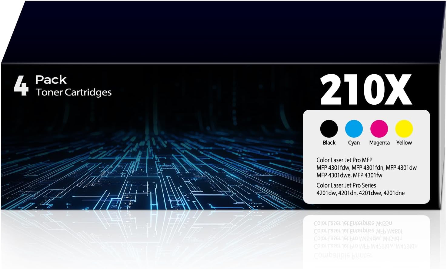 - 210X Toner High Compatibility: 210X toner cartridges Combo Pack Compatible for hp Color Laser Jet Pro MFP 4301fdw toner cartridges, Color Laser Jet Pro MFP 4301fdn toner cartridges, Color Laser Jet Pro MFP 4301dw toner cartridges, Color Laser Jet Pro MFP 4301dwe toner cartridges, Color Laser Jet Pro MFP 4301fw toner cartridges; 210X toner Compatible for Color Laser Jet Pro 4201dw toner cartridges, Color Laser Jet Pro 4201dn toner cartridges, Color Laser Jet Pro 4201dwe toner cartridges, Color Laser Jet Pro 4201dne toner cartridges