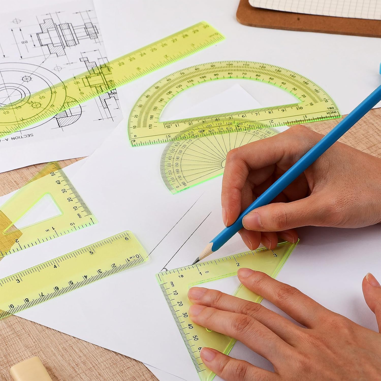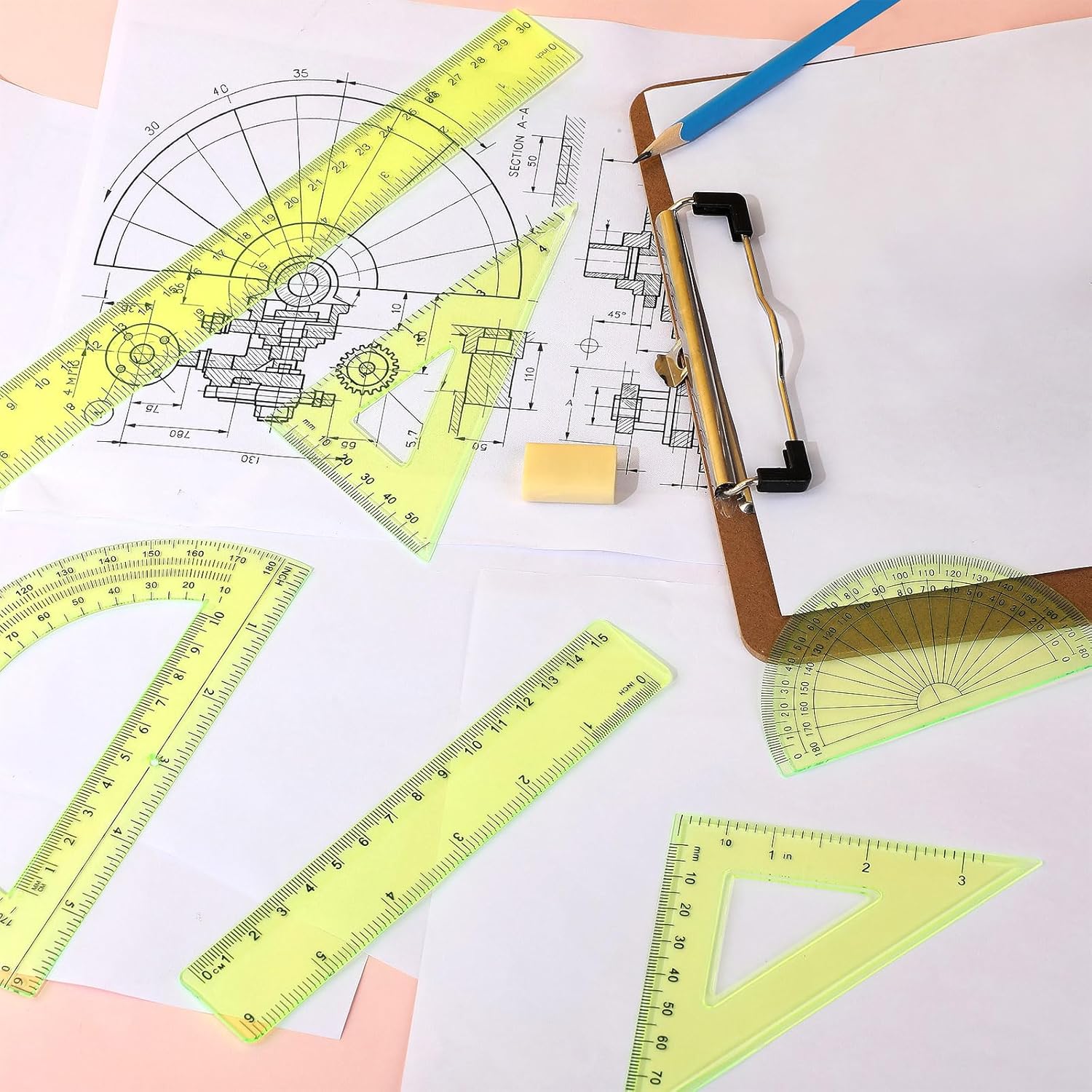 Tenare 1 Set Plastic Clear Math Set Includes Protractor Triangle Rulers 12 Inch 6 Inch Straight Geometry Math Transparent Ruler Measuring Tool for School Office Home Supplies(Yellow)