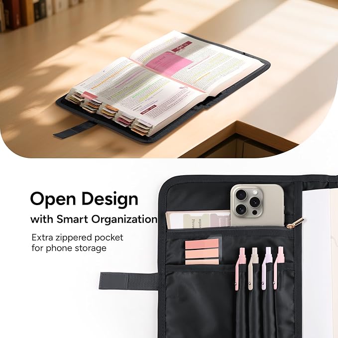 - 【Open-Top Design & Smart Layout】This Bible book cover features a flat-opening, open-top design with a quick-access Velcro closure, allowing the Bible to lay fully flat for effortless reading—no more zippers or stuffing. Its simplified interior layout is clean and organized, while smart compartments including 1 card slot, 3 pen holders, and a zippered pocket securely store your Bible, pens, tabs, phone, and other Bible study supplies—keeping everything accessible for study anywhere.