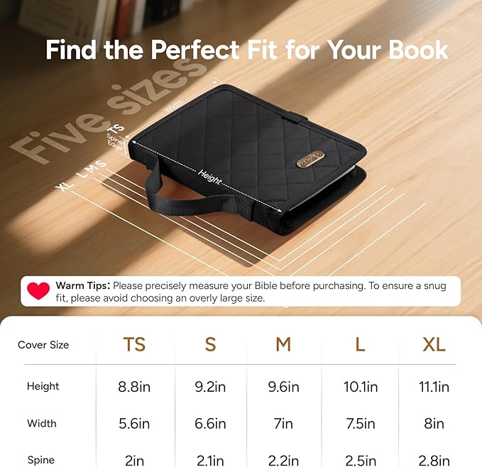 - 【5 Sizes Available】5 different sizes are available, suitable for both hardcover and paperback books, the width of the cover can be adjusted to flexibly store different versions of Bibles, a variety of sizes for you to choose. To ensure the best fit, please measure the Bible accurately and compare it with the size chart to make sure the Bible cover case for women fits and guards your faith texts.(Size:XL Width 8, Height 11⅛, Spine 1⅞ - 2¾)