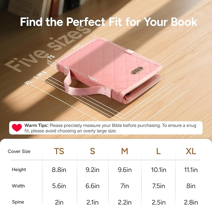 - 【5 Sizes Available】5 different sizes are available, suitable for both hardcover and paperback books, the width of the cover can be adjusted to flexibly store different versions of Bibles, a variety of sizes for you to choose. To ensure the best fit, please measure the Bible accurately and compare it with the size chart to make sure the Bible cover case for women fits and guards your faith texts. (Size:TS Width 5⁵⁄₈, Height 8¾, Spine 5⁄₈ - 1⅜)