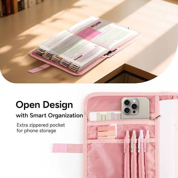 - 【Open-Top Design & Smart Layout】This Bible book cover features a flat-opening, open-top design with a quick-access Velcro closure, allowing the Bible to lay fully flat for effortless reading—no more zippers or stuffing. Its simplified interior layout is clean and organized, while smart compartments including 1 card slot, 3 pen holders, and a zippered pocket securely store your Bible, pens, tabs, phone, and other Bible study supplies—keeping everything accessible for study anywhere.
