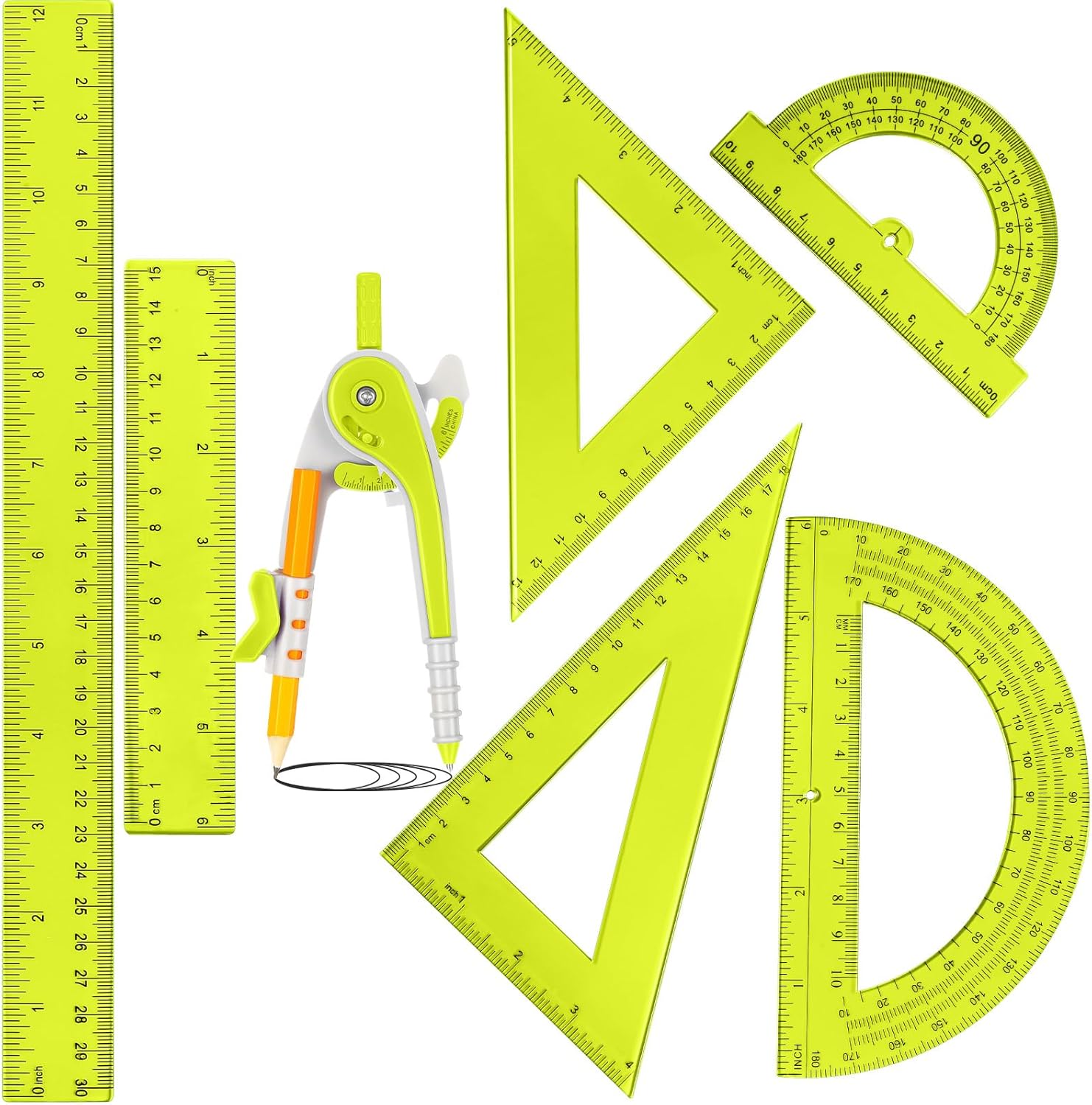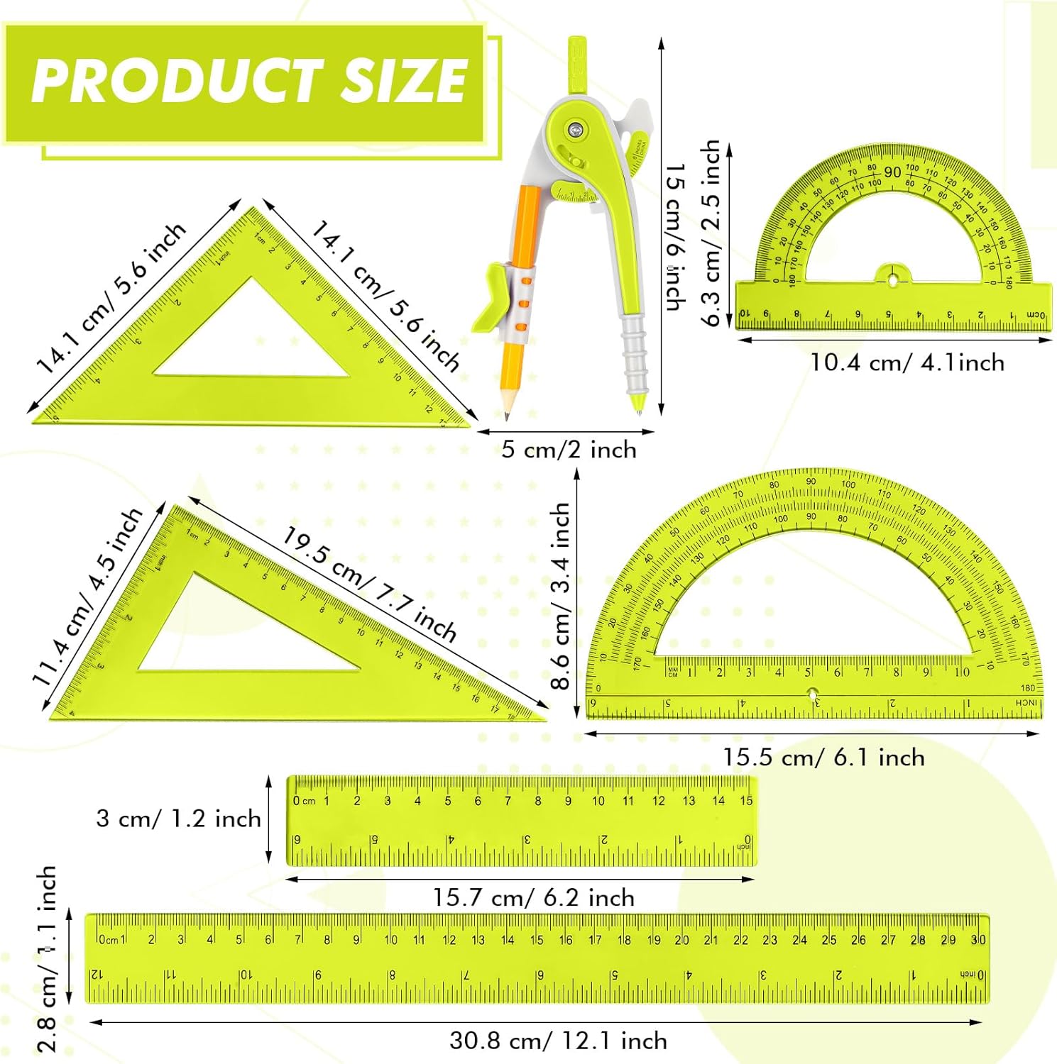 - Geometry Tool Set for Professionals Students: includes 2 pcs plastic ruler (11.81'' / 30 cm, 5.91'' / 15 cm), 2 pcs hollow protractor (6'' / 15.24 cm, 4'' / 10.16 cm), 1 pcs bevel triangle, 1 pcs isosceles triangle and 1 pcs plastic compass with pencil, this comprehensive set meets all drafting, measuring, and drawing needs