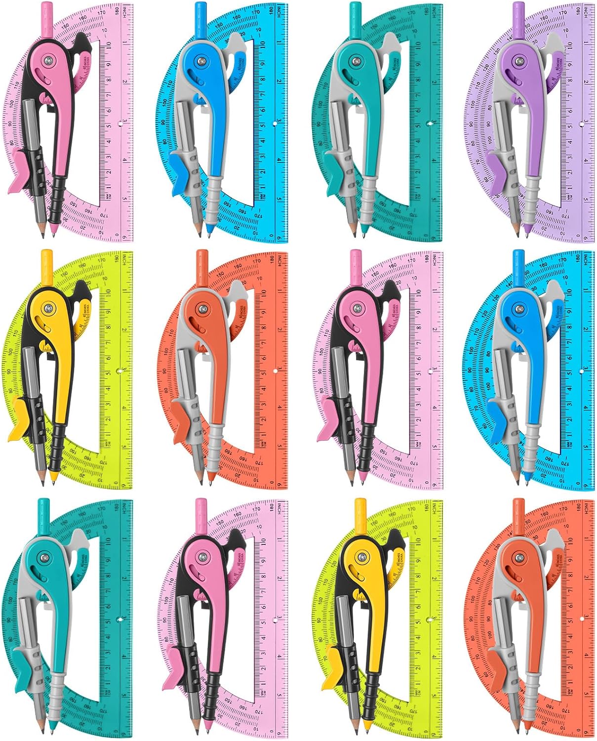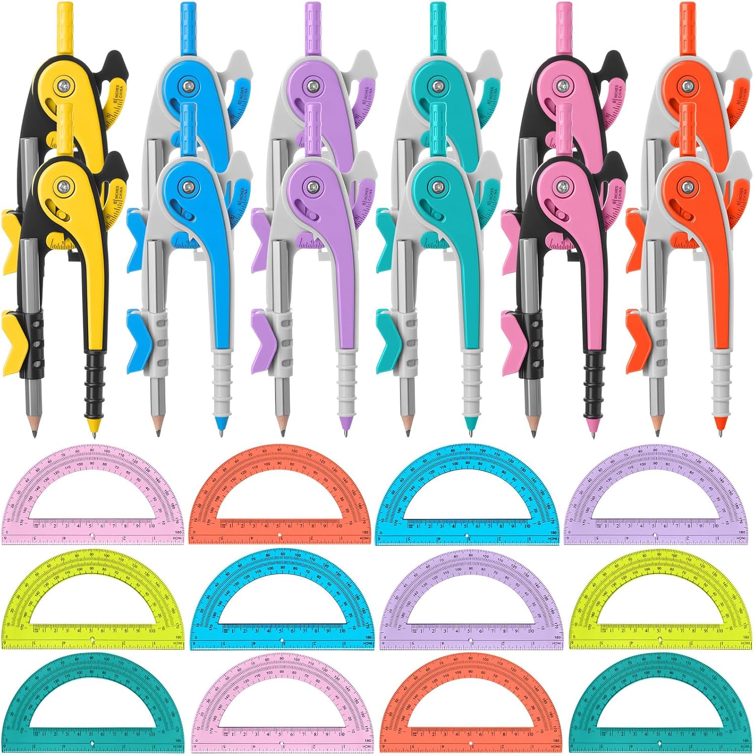 - 12 Compass and Protractor Set: Compasses and protractors are suitable for drawing circles and measuring angles, including six colors of red, pink, yellow, blue, green, and purple, with bright color combinations, the compass comes with round corner design on compass needle, safe and reliable to use without worrying about scratching, suitable for students, teachers, engineers, designers, artists, etc