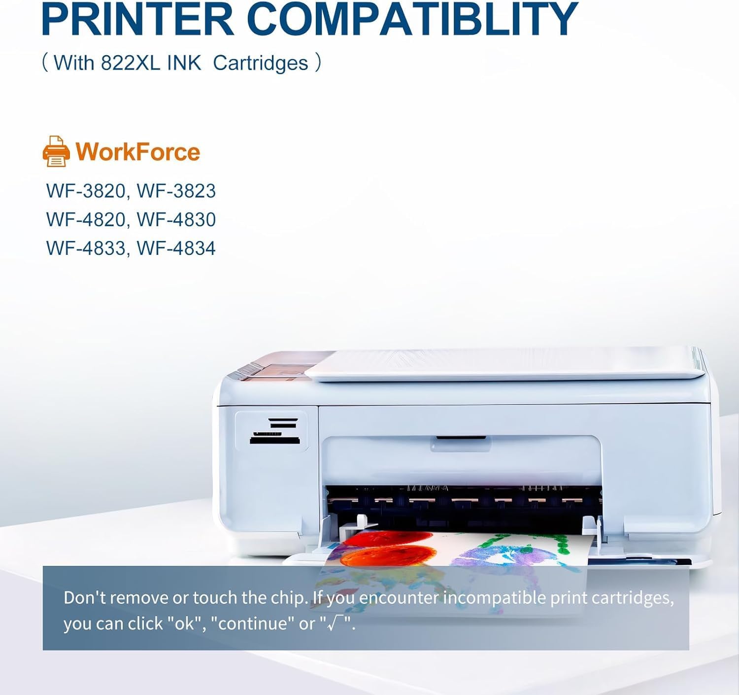 - ♥ Printer Compatibility for epn 822 ink: The 822XL ink cartridges are compatible with Epson WorkForce Pro WF-3820, WF-3823, WF-4820, WF-4830, WF-4833,WF-4834 Printers