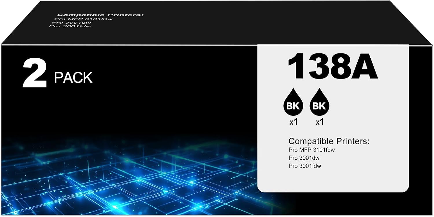 - Compatible for HP 138A Black Toner Cartridges 2 Pack Printer Model:for hp 138A black toner cartridges compatible for hp color pro mfp 3101fdw toner, color pro 3001dw toner, Pro MFP 3101sdw, color pro 3001fdw toner.