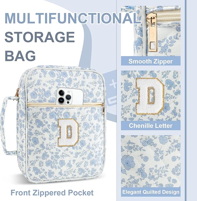 Personalized Initial Bible Cover Case for Women Girls Kid - Large Quilted Bible Case with Handle, Stylish Chenille Letter Bag Study Supplies, Perfect Christmas Gifts for Christians (Blue Flower-D)
