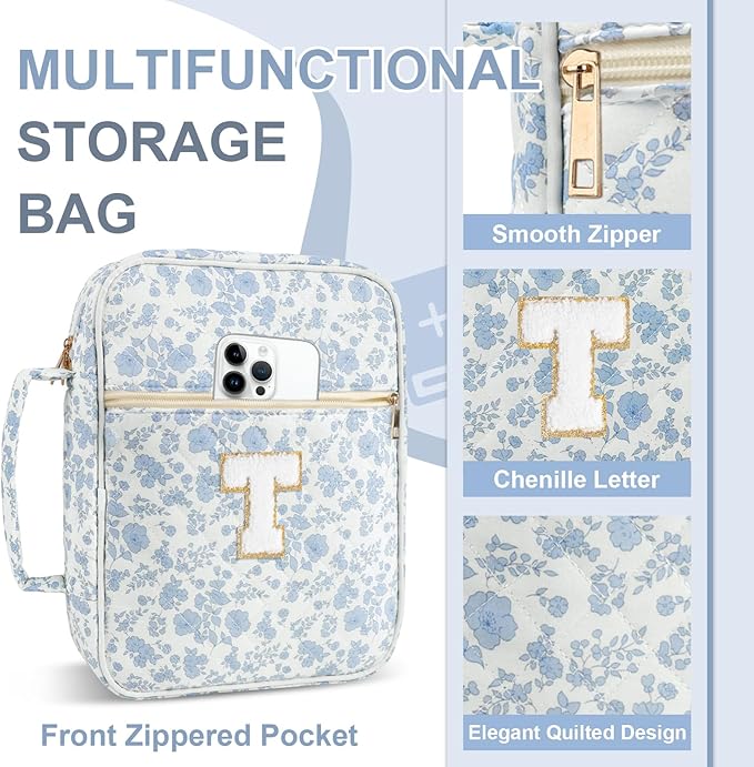 Personalized Initial Bible Cover Case for Women Girls Kid - Large Quilted Bible Case with Handle, Stylish Chenille Letter Bag Study Supplies, Perfect Christmas Gifts for Christians (Blue Flower-T)
