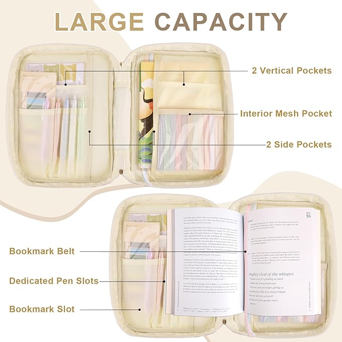 - Perfect Size & Organized Storage Measuring 11.8 x 8.89 x 3 inches, this Bible case is lightweight with large capacity, fits most standard and large Bibles. It includes a main zippered compartment, a front zippered pocket, interior mesh pocket, multiple dividers, and pen slots—keeping your Bible and Bible study supplies neatly arranged and easy to access.