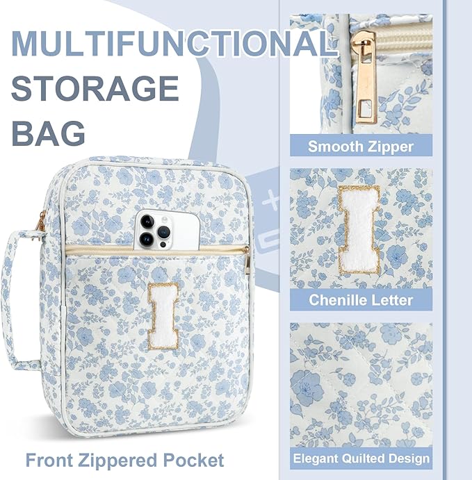 Personalized Initial Bible Cover Case for Women Girls Kid - Large Quilted Bible Case with Handle, Stylish Chenille Letter Bag Study Supplies, Perfect Christmas Gifts for Christians (Blue Flower-I)