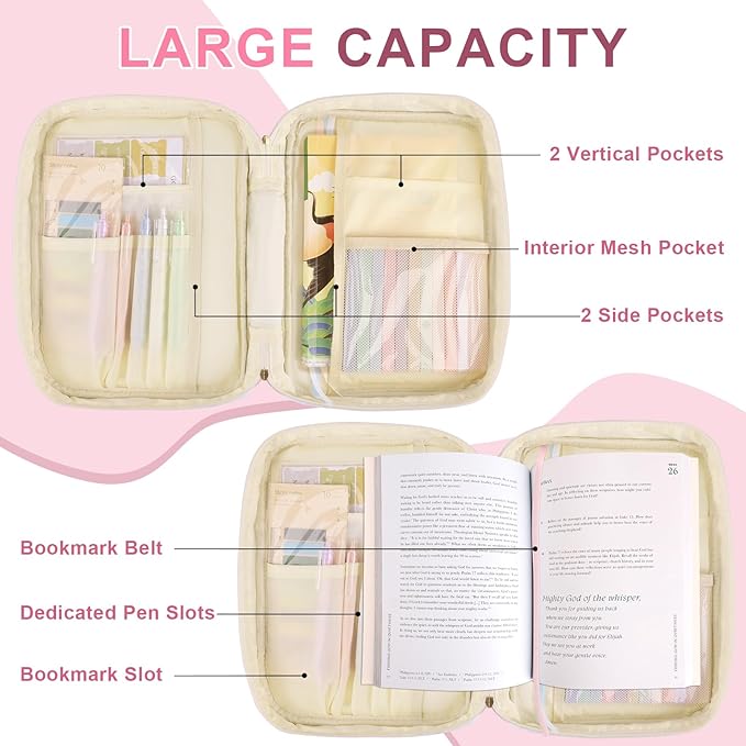 - Perfect Size & Organized Storage Measuring 11.8 x 8.89 x 3 inches, this Bible case is lightweight with large capacity, fits most standard and large Bibles. It includes a main zippered compartment, a front zippered pocket, interior mesh pocket, multiple dividers, and pen slots—keeping your Bible and Bible study supplies neatly arranged and easy to access.