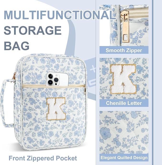Personalized Initial Bible Cover Case for Women Girls Kid - Large Quilted Bible Case with Handle, Stylish Chenille Letter Bag Study Supplies, Perfect Christmas Gifts for Christians (Blue Flower-K)