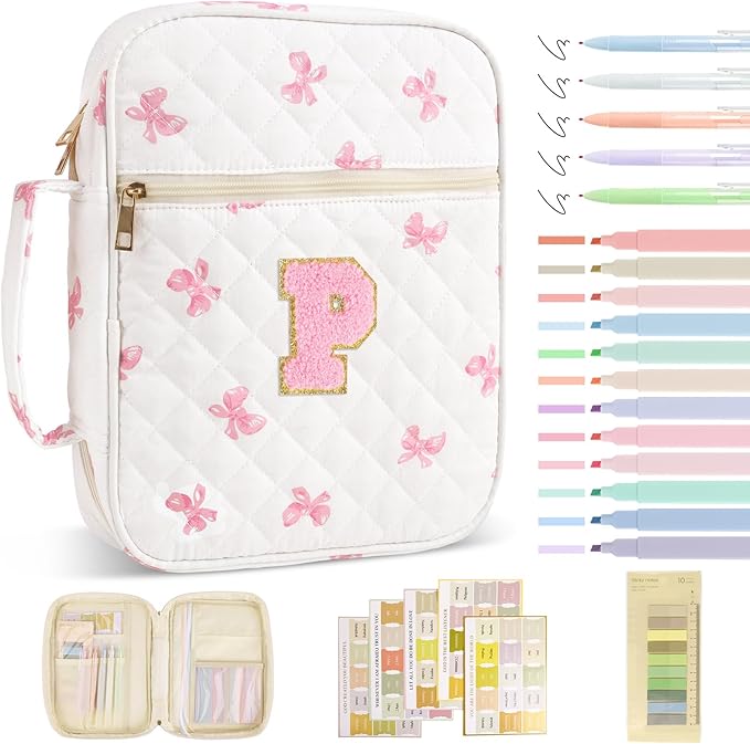 Personalized Initial Bible Cover Case for Women Girls Kid - Large Quilted Bible Case with Handle, Stylish Chenille Letter Bag Study Supplies, Perfect Christmas Gifts for ChristiansWomen (Pink Bow-P)